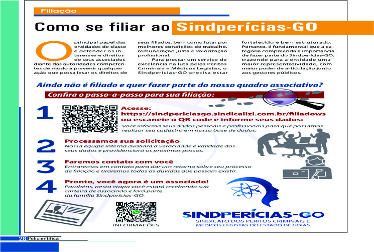 Para prestar um serviço de excelência na luta pelos Peritos Criminais e Médicos Legistas, O SINDPERICIA-GO precisa estar fortalecida, bem estruturada . Contudo, é fundamental que a categoria compreenda a importância de fazer parte do SINDPERICIA-GO, trazendo para a entidade uma maior representa.